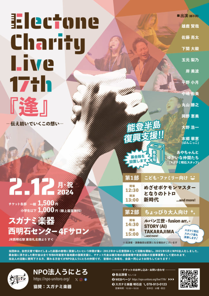 2024年2月12日、兵庫県明石市・スガナミ楽器西明石ミュージックセンターサロンにて、チャリティライブ17th『逢』を開催しました。
